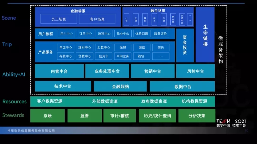 “场景建设”层是帮助拓展业务触角、提供统一交互体验、输出整体品牌形象的系统层次,一方面帮助金融企业建成“柜台服务、移动服务、远程服务与客户自助服务”相结合的线上线下融合服务模式,另一方面是依托生态链接系统体系,广泛开展跨行业合作,建立社群、农银、税银、银企、学银、供应链、交易市场等不同领域的融合场景,更好地将金融服务扎根于用户的生活生产过程当中,帮助金融机构实现场景与用户的连接,满足用户所需、赋能产业发展。“旅程服务”是ModelB@nk5.0整体架构的核心层次,由用户旅程、产品服务和资金投资三部分相关系统组成,强调按照用户在特定场景下的不同服务需求定制千人千面的流程体验及产品服务,让用户宛如在高端旅行中一般,舒服自然地享受不同内容的金融服务过程。“能力输出”层是金融企业将基础能力以集中方式向旅程服务进行输出的系统层次。由业务层面的四个中台体系:内管中台、业务服务中台、营销中台和风控中台,以及负责基础技术能力输出的三个中台体系:数据中台、技术中台、金融超脑共同组成。金融超脑将提供整套AI能力应用,帮助业务系统和技术平台实现不同的智能化需求,释放出更强大的潜能。“资源积累”层强调将通过湖仓一体技术沉淀的数据资源,如客户数据资源、外部数据资源、政府数据资源、机构数据资源等,通过数据中台实现实时分析与传输,快速地将数据价值赋能到业务处理以及经营管理过程当中。“组织管理”层是整体架构面向金融企业监管、审计和经营管理等层面,保障金融企业平稳运行发展的根基。在ModelB@nk5.0整体架构中,通过数据中台、金融超脑对数据价值的重塑,“组织管理”层的相关系统会更加强调智能化,帮助金融机构由内而外实现组织管理的数字化转型。ModelB@nk5.0所含五个层次的系统都将在技术中台提供的统一微服务框架下,充分发挥分布式技术带来的性能和部署优势,实现整体化的开发运维一体化智能管理,支撑起未来业务的高速发展。
